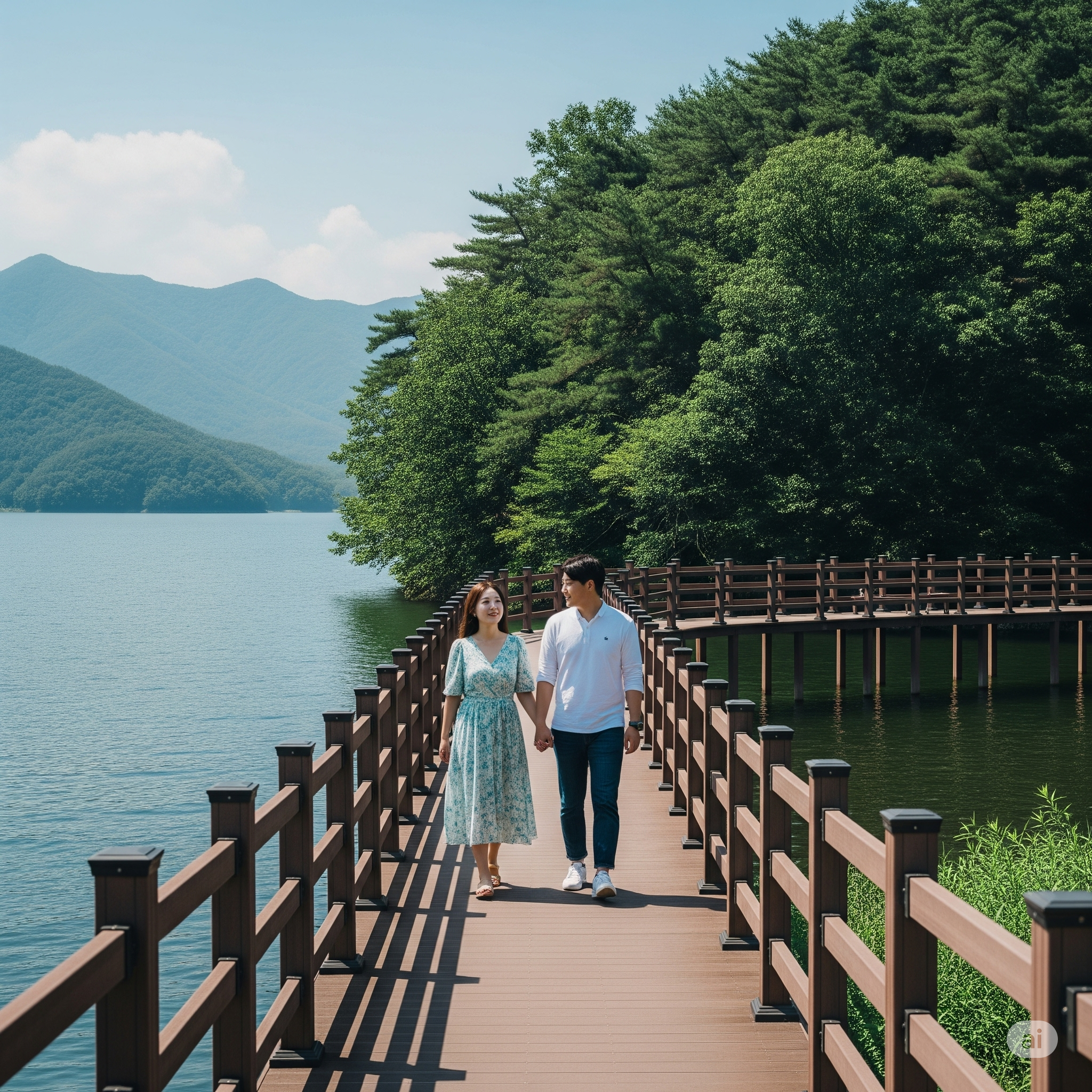 오륜동 여행의 핵심. 잔잔한 수원지를 따라 나무 데크길과 흙길, 숲길이 끝없이 이어져 있습니다. 코스가 완만하고 잘 정비되어 있어 남녀노소 누구나 편안하게 산책과 트레킹을 즐길 수 있습니다.